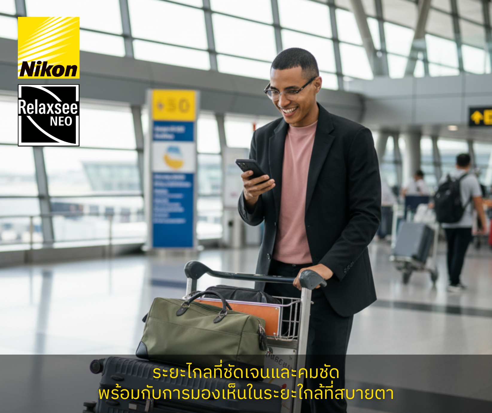 NIKON RELAXSEE™ NEOโฟกัสได้อย่างสบายตาในขณะใช้จอดิจิทัล เทคโนโลยี Twin มี Clear Zone ที่ส่วนบนของเลนส์เพื่อให้มองเห็นได้คมชัดระยะไกล |